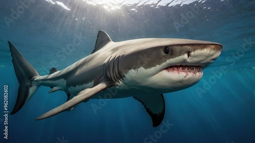 Fototapeta premium A Great White Shark Swimming Gracefully in Clear Blue Ocean Waters During a Sunny Day