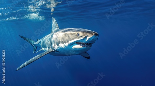 © Boonnam Burart, Fototapeta premium A great white shark swimming in deep blue ocean waters, its sharp teeth slightly visible