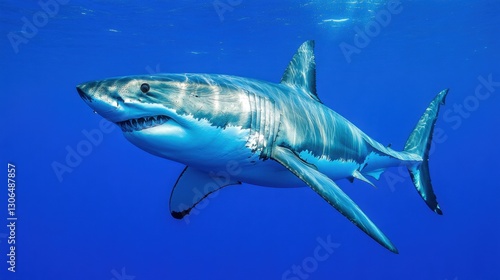Fototapeta premium A great white shark swimming in deep blue waters, its powerful body gliding...