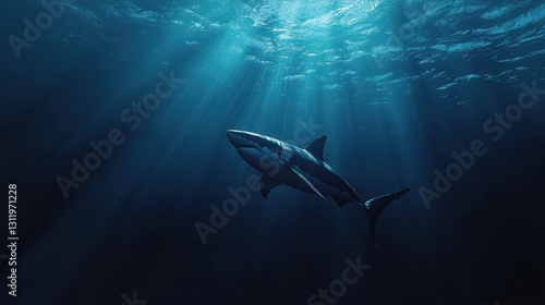 © Svitlana, Fototapeta premium A great white shark swimming in deep blue waters, its sleek body cutting through the ocean