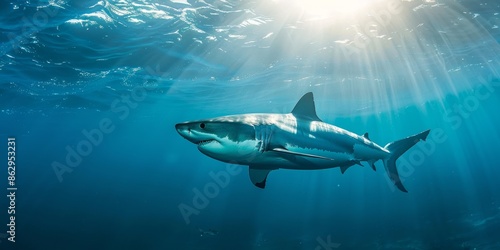 © silence, Fototapeta premium A great white shark swimming in the deep blue ocean.