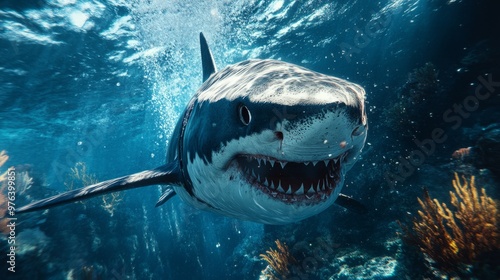 Fototapeta premium A great white shark swimming in the deep sea