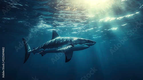 © Alief Shop, Fototapeta premium A great white shark swimming near the ocean surface, powerful and graceful, intense blue water