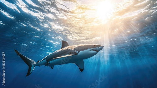 Fototapeta premium A great white shark swimming through crystal-clear blue waters, sunlight filtering through the ocean surface