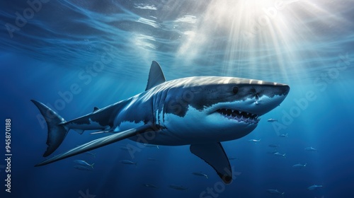 Fototapeta premium A great white shark swims gracefully in the deep blue ocean