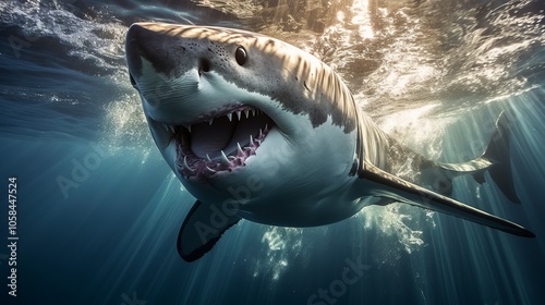 © Maksym, Naklejka premium A great white shark swims gracefully through sunlit waters near a vibrant marine environment