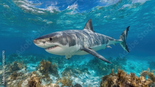 Obraz premium A great white shark swims gracefully through vibrant turquoise waters filled...