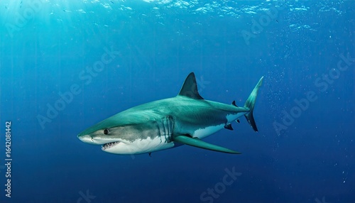 Fototapeta premium A great white shark swims in clear blue water, its body angled slightly...