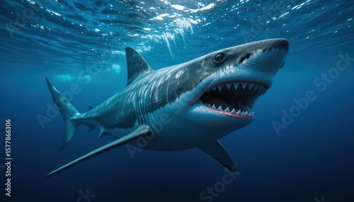 Fototapeta premium A great white shark swims in the ocean with its mouth open revealing teeth