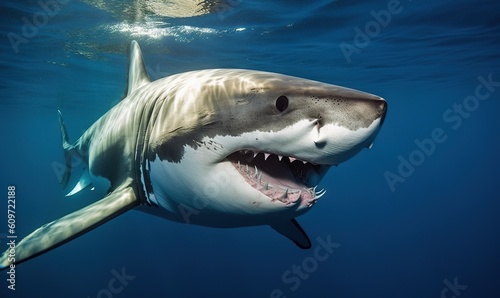 Naklejka premium a great white shark with its mouth open in the water. generative ai