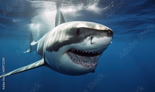Naklejka premium a great white shark with its mouth open in the water. generative ai