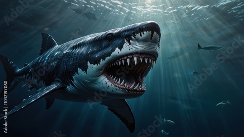 Fototapeta premium A great white shark with its mouth open, teeth bared, swims towards the surface of the water. Sunlight shines through the water above, casting a spotlight on the shark.
