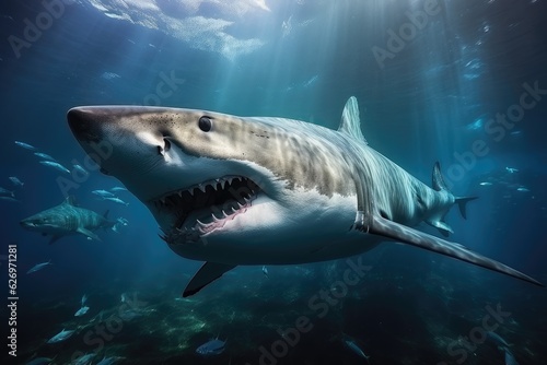 Fototapeta premium A great white shark with sharp teeth in motion is swimming in the ocean...