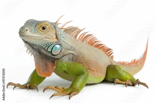 © Andrii Zastrozhnov, Obraz premium A green and orange lizard with a blue bead on its head. The lizard is standing on a white background