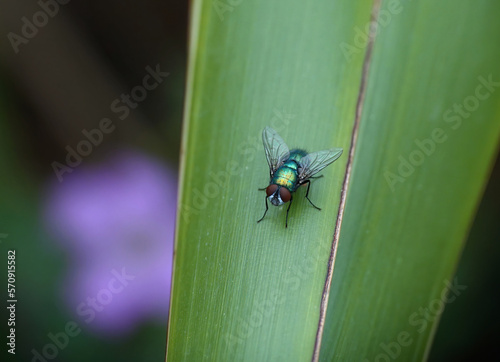 Fototapeta premium A green bottle fly on a green leaf in summer.