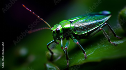 Fototapeta premium A green bug with antennae standing on a leaf. Close up shot. Generative AI.
