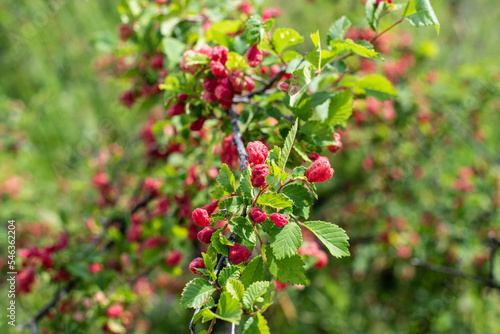 © Hyusein, Obraz premium A green bush with red diseased leaves on a sunny day.