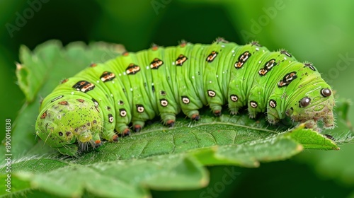 © MakoPoko, Naklejka premium A green caterpillar crawling on a vibrant green leaf, showcasing the beauty of nature.