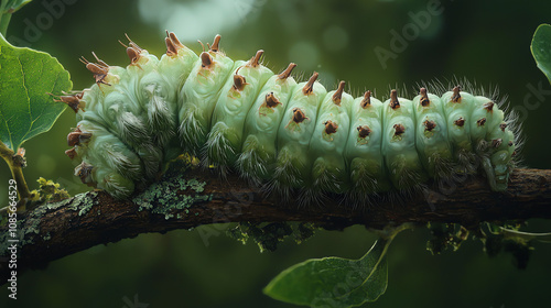 © ARM, Naklejka premium A green caterpillar crawls slowly along a branch, showcasing its segmented body and spiky protrusions in a lush forest setting