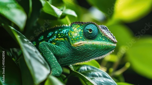 © pinporn manosri, Obraz premium A green chameleon blending into its surroundings, showcasing nature's incredible adaptability