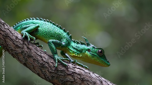 Obraz premium A green chameleon perches on a branch in a close-up nature shot. Its scaly...