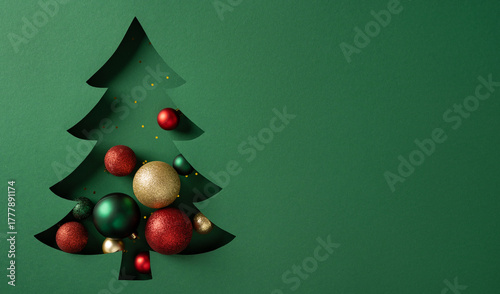© ActionGP, Naklejka premium A green Christmas tree silhouette adorned with red green and gold baubles sits on a matching green background