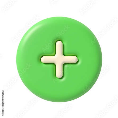 © MS Store, Obraz premium A green circular button with a cream plus symbol in the center rendering isolated on transparent background