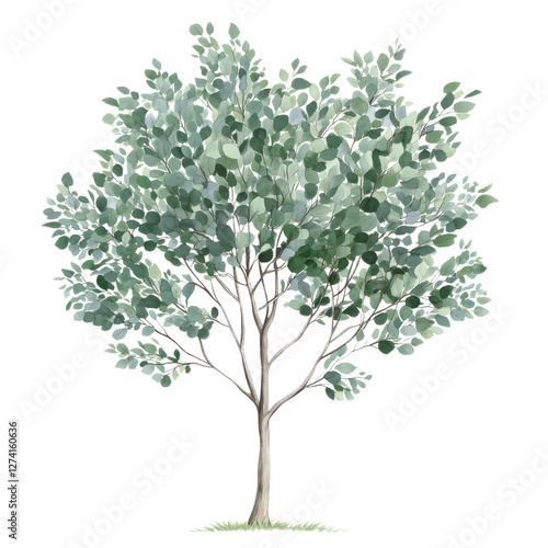 © Patcharaphorn, Obraz premium a green eucalyptus tree clipart, botanical element, soft green leaves and gray bark, isolated on white background