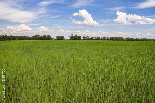 © Марина Красавина, Fototapeta premium A green field of wheat under a blue sky.