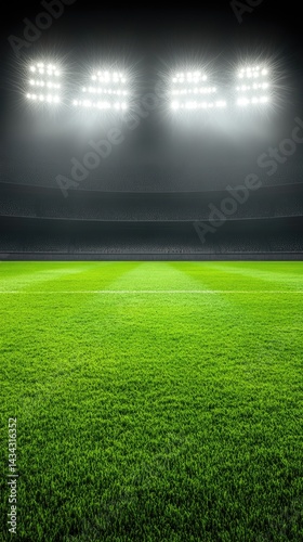 © Trionorejo, Obraz premium A green field under bright lights with a dark background of stadium seating