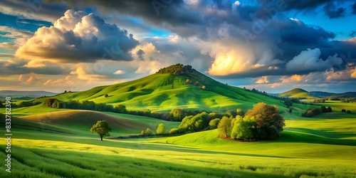 © Vitaliy, Fototapeta premium A green field with a hill in the background and clouds in the sky above it, with a few trees on top of the hill, a picture, color field, beautiful landscape,