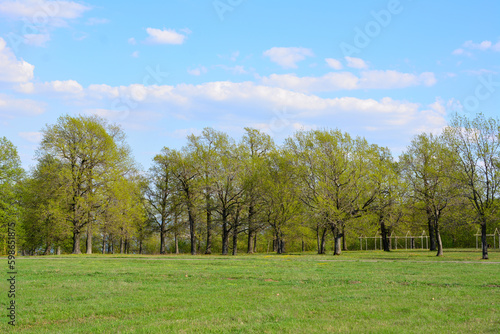 © Irina, Obraz premium A green field with oak forest and a blue sky in the background