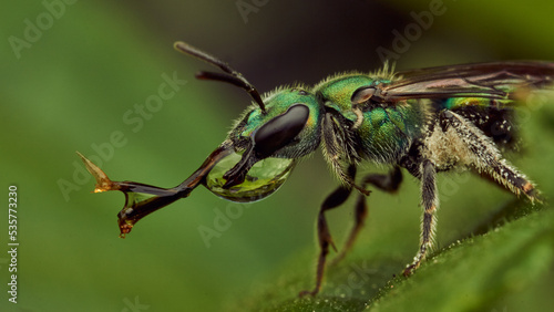 © DiazAragon, Fototapeta premium A green fly drinking water perched on a green leaf