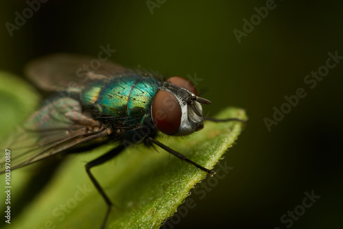 © DiazAragon, Fototapeta premium A green fly perched on a green leaf