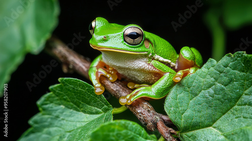 © alfa27, Naklejka premium A green frog is sitting on a leafy branch