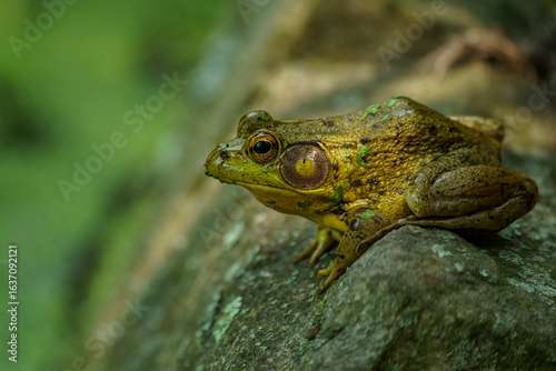 © Gordon, Fototapeta premium A green frog perched on a rock near a pond