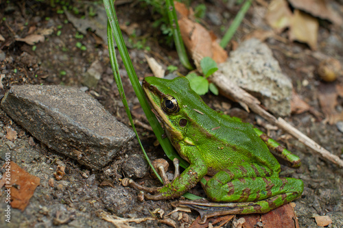 Fototapeta premium A green frog resting near the rock
