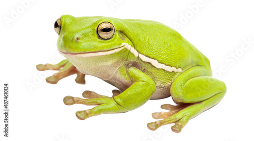 © Hub, Obraz premium A green frog sitting on a transparent background looking alert and calm