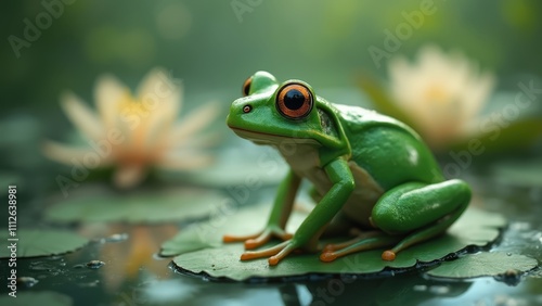 © Oleg, Naklejka premium A green frog sitting on top of a lily pad