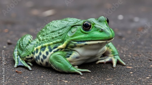 © Wattana, Fototapeta premium A green frog with black spots on a wet surface.