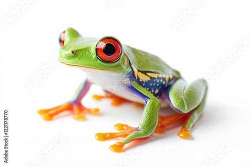 © Alexei, Obraz premium A green frog with vivid red eyes is sitting on a clean white surface