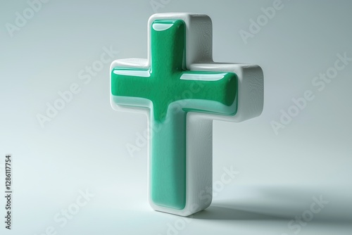 © boler, Fototapeta premium A Green Glossy Cross Is Standing Isolated On A White Surface