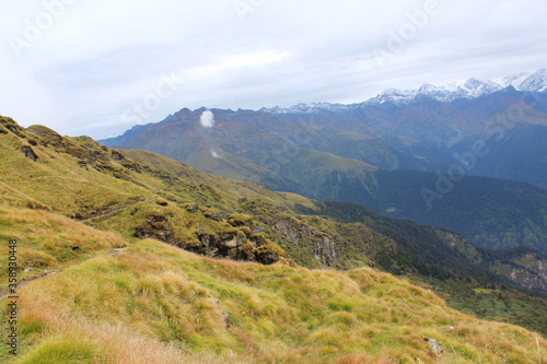 Fototapeta premium a green grass meadow in the region of lower Himalaya.