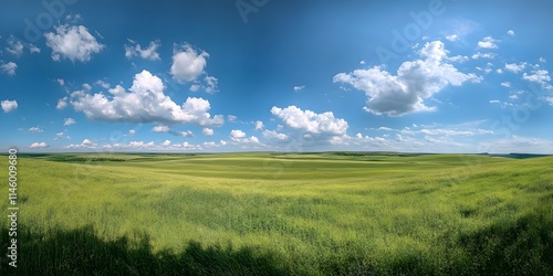 Fototapeta premium A green, grassy field under the blue sky with white clouds, a large grain...