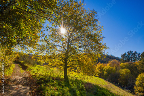 © mschauer, Fototapeta premium a green hilly meadow in autumn with hiking trail and tree in backlight with sun rays