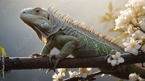 Obraz premium A green iguana perched on a branch surrounded by white flowers in a soft-lit...