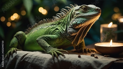 © Tina, Obraz premium A green iguana rests on a table beside a candle and a bowl, surrounded by soft lighting.