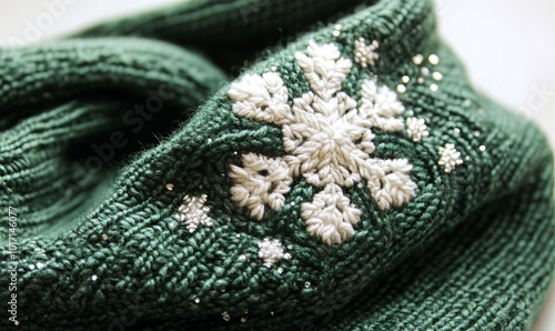 © Galina, Fototapeta premium A green knit scarf with a snowflake on it