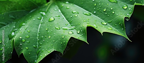 Fototapeta premium A green leaf glistening with raindrops, showcasing the intricate patterns created by each droplet. The leaf is vibrant and fresh, reflecting the essence of a rainy day in a garden.