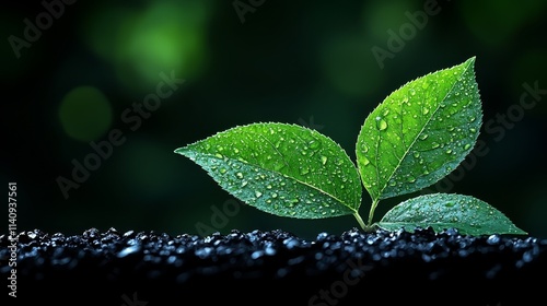© Albert, Fototapeta premium A green leaf with water droplets on it sitting on top of a pile of dirt